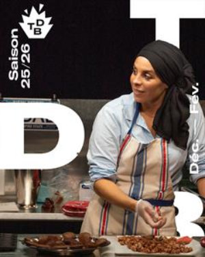 Sur scène, une cuisine avec au centre un vaste plan de travail et des ustensiles de toutes sortes. L'ensemble est surmonté d'une caméra qui filmera les mouvements de la comédienne pendant son travail de cuisine (tout au long du spectacle, elle préparera en direct des pralines et des fondants au choc...