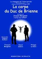 Impossible d'en dire plus sans déflorer le sujet et le suspense qui toujours chez Jacques Mougenot constitue la trame de ses pièces prenant un malin plaisir à embarquer insidieusement le spectateur dans des chevauchées métaphysiques habiles, poétiques, déconcertantes et pleines d'humour. Sachez tout de même qu'il décrit ainsi sa pièce : "La carpe du duc de Brienne a deux parties, les pattes et les ailes, ce qui pour un poisson n'est pas banal !"