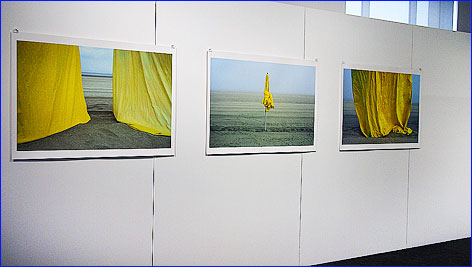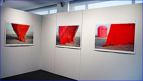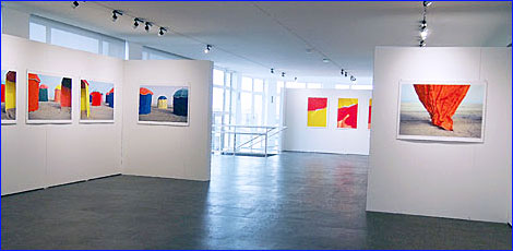 Tissu froissé des parasols, texture du sable, empreintes laissées par les rares visiteurs matinaux, tout surgit avec intensité, d’autant plus fortement grâce à l’attention particulière accordée aux techniques d’impression numérique.
