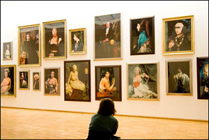 A l'occasion d'une commande pour des porcelaines, Cindy Sherman s'attaque, avec les History Portraits/Old Masters, ici présentés en galerie, à l'iconographie de la peinture figurative classique pour incarner les modèles plus ou moins imaginaires de portraits historiques d'un réalisme grotesque et iconoclaste.
