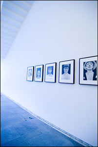 L'exposition commence par les 5 portraits de la série Untitled A-E de 1975. Photographies en noir et blanc peu contrastées, comme des photomatons, de portraits en buste, visage souriant de face, le regard fixant l'objectif, épaules souvent découvertes, laissant parfois voir des marques de bronzage. Clown amateur, femme fatale ou jeune femme timide, le visage malléable et neutre de Cindy Sherman se grime, selon différents âges, avec quelques rares éléments vestimentaires appuyant la physionomie.